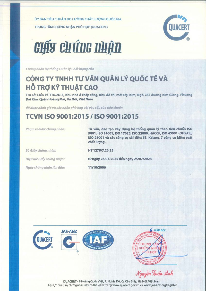 1. Chứng chỉ ISO 9001:2015 lĩnh vực tư vấn và đào tạo