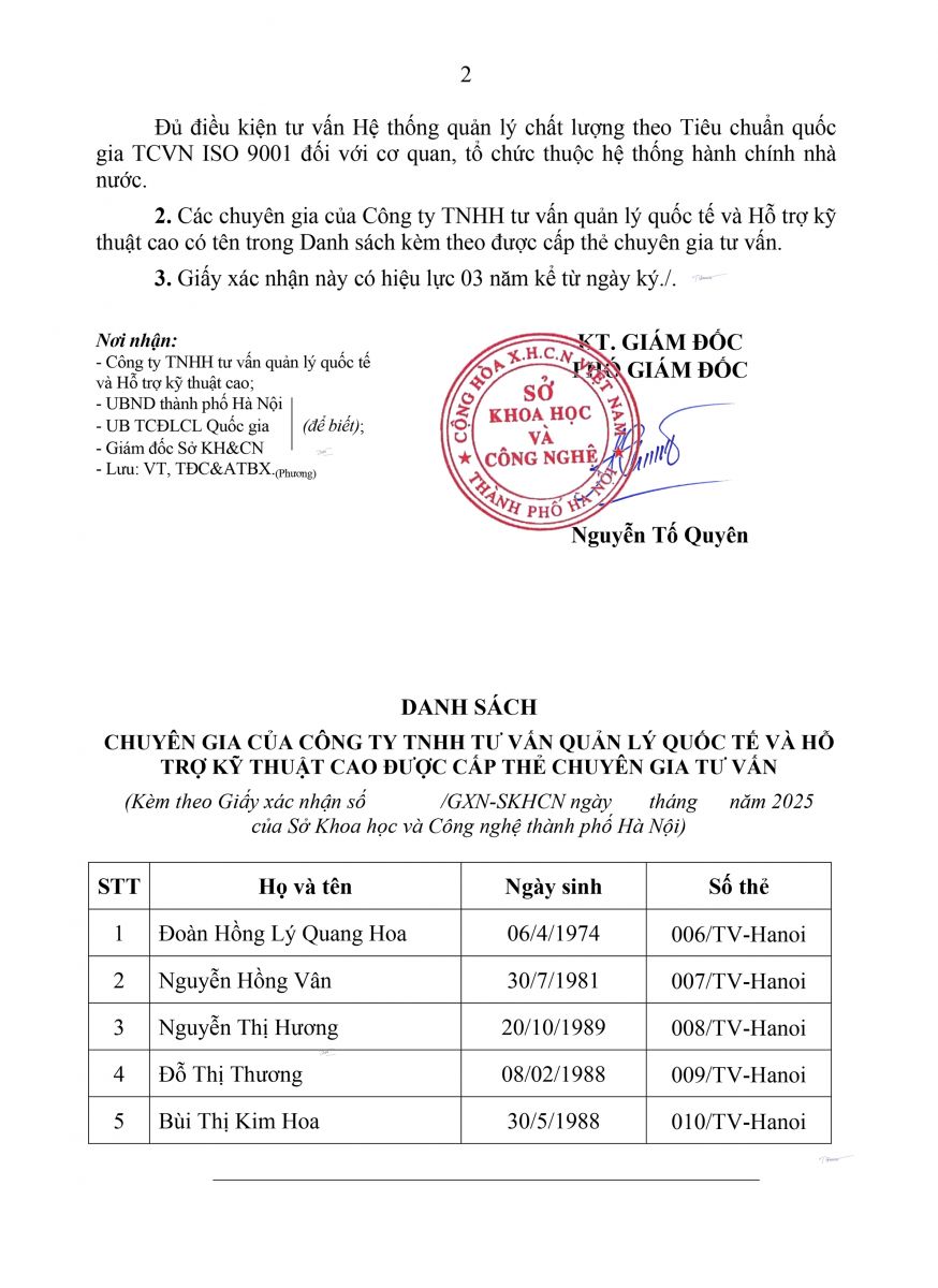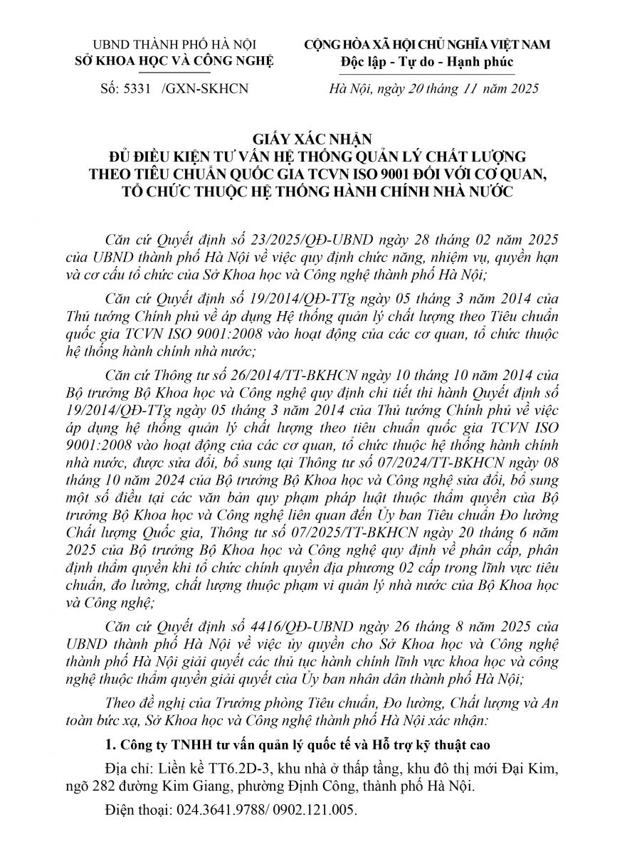 2. Giấy xác nhận đủ điều kiện thực hiện Tư vấn Hệ thống Quản lý Chất lượng theo tiêu chuẩn Quốc gia TCVN ISO 9001:2015 đối với cơ quan Hành chính Nhà nước.
